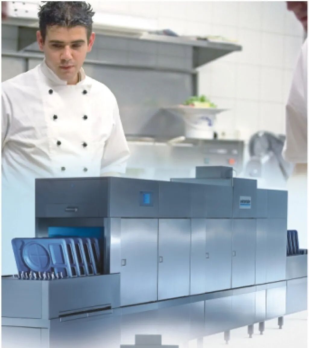 通道式洗碗机:适合300-1000人的中型食堂、医院、酒店宴会中心等餐饮场所使用。该机型采用连续式篮筐传送方式,可在短时间内洗涤大量餐具,提高餐具周转率。可以说是洗碗机中的战斗机。