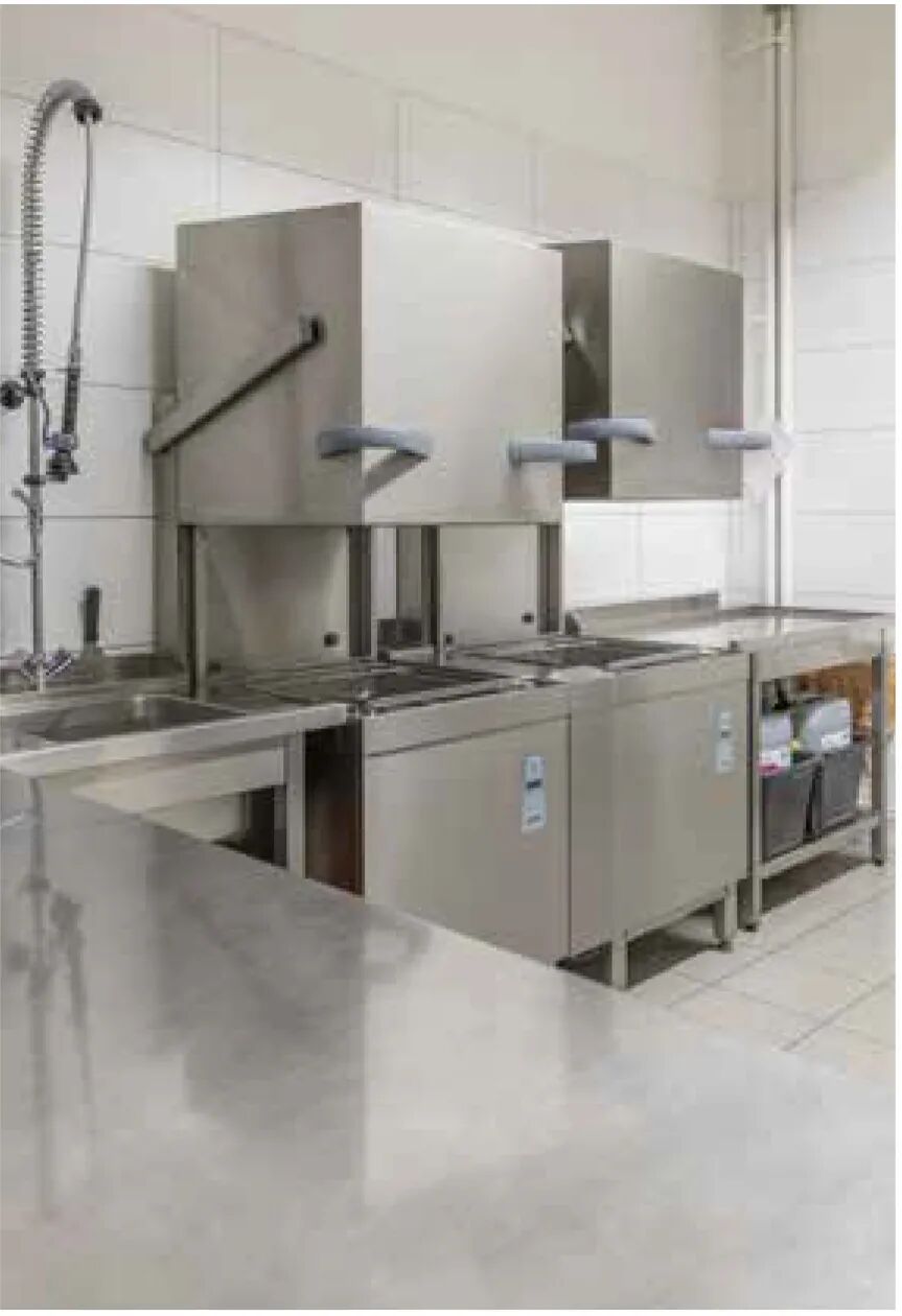 台下式洗碗机:适合50人以内的微型餐厅、员工食堂、酒吧、快餐连锁等餐饮机构使用,可以直接置于工作台下,灵活性强,对空间、电力等要求不高。