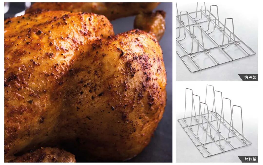 在烤制的过程中将鸡鸭采用垂直的方式放置,能在烟囱效应的影响下大大缩短了烹制时间,同时也得到了鲜嫩多汁的胸脯肉与色泽均匀的表皮。鸡鸭超级烤架操作简单,装载迅速。